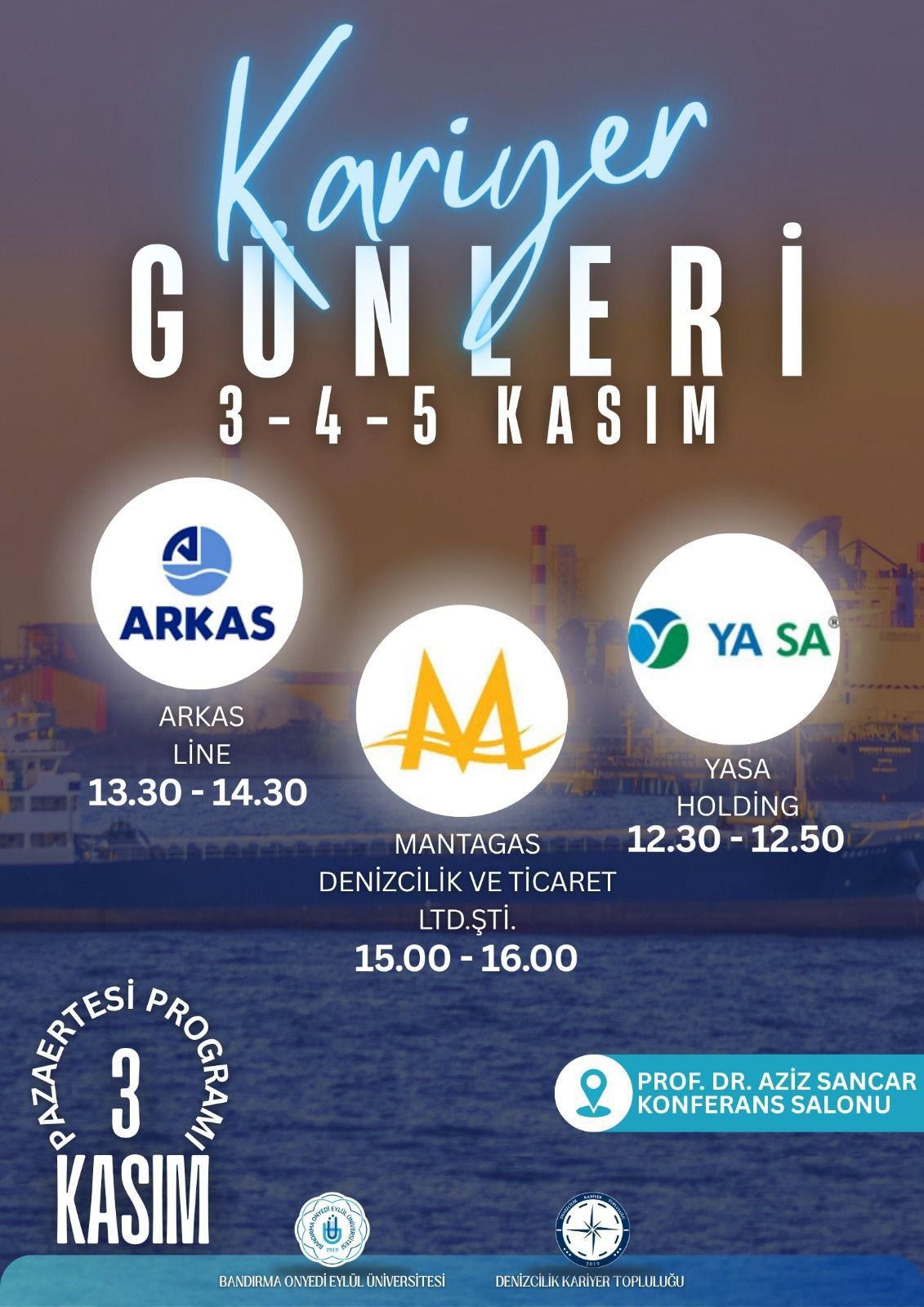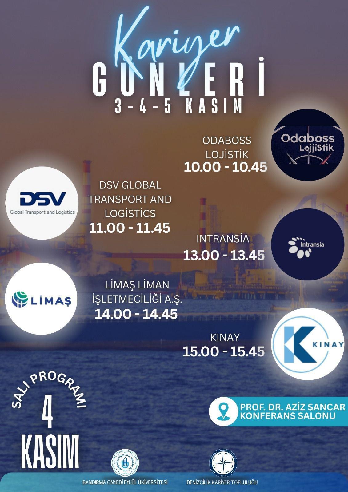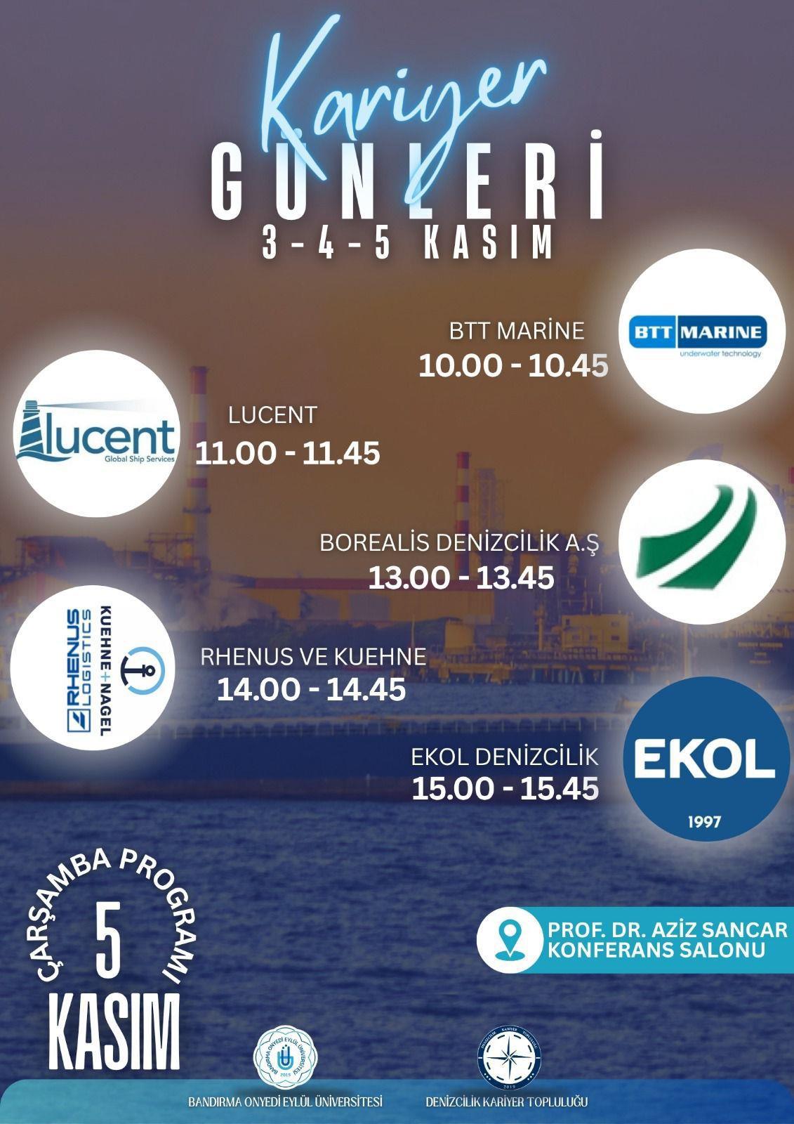 Denizcilik Kariyer Topluluğu tarafından organize edilen etkinlik maratonu, 3-4-5 Kasım tarihlerinde Prof. Dr. Aziz Sancar Konferans Salonu'nda "Kariyer Günleri" ile başlayacak. Üç gün boyunca Meslek Yüksekokulu öğrencileri; Arkas Line, YASA Holding, DSV Global Transport, Limaş Liman İşletmeciliği, Kınay, Ekol Denizcilik ve BTT Marine gibi denizcilik ve lojistik sektörünün dev firmalarının temsilcileriyle doğrudan tanışma şansı yakalayacak.
