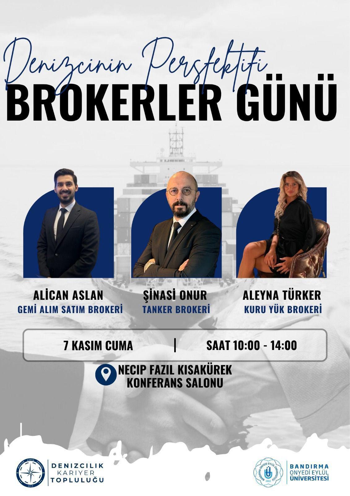 Haftanın kapanışı ise 7 Kasım Cuma günü "Brokerler Günü" ile yapılacak. Gemi Alım Satım Brokeri Alican Aslan, Tanker Brokeri Şinasi Onur ve Kuru Yük Brokeri Aleyna Türker, deniz ticaretinin bu kritik alanını öğrencilere tanıtacak.