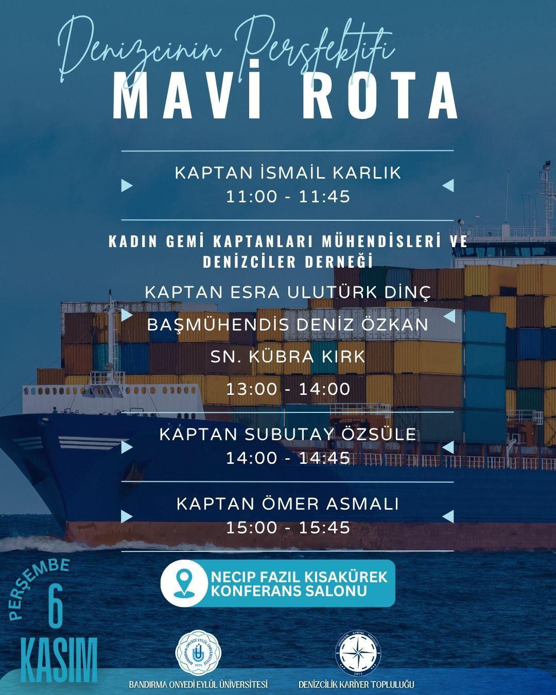 Kariyer haftası, 6-7 Kasım tarihlerinde Necip Fazıl Kısakürek Konferans Salonu'nda "Denizcinin Perspektifi" başlıklı oturumlarla devam edecek. 6 Kasım Perşembe günü "Mavi Rota" temasıyla Kaptan İsmail Karlık, Kaptan Esra Ulutürk Dinç ve Başmühendis Deniz Özkan gibi tecrübeli denizciler tecrübelerini paylaşacak.